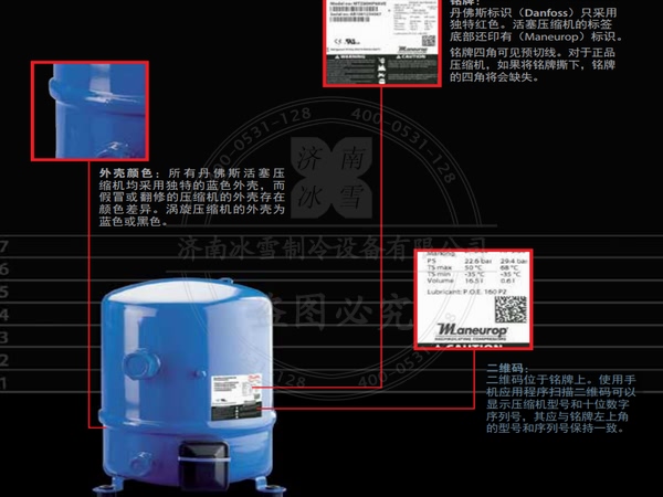1、外殼顏色:所有丹佛斯活塞壓縮機(jī)均采用獨(dú)特的藍(lán)色外殼,而假冒或翻修的壓縮機(jī)的外殼存在顏色差異。渦旋壓縮機(jī)的外殼為藍(lán)色或黑色。